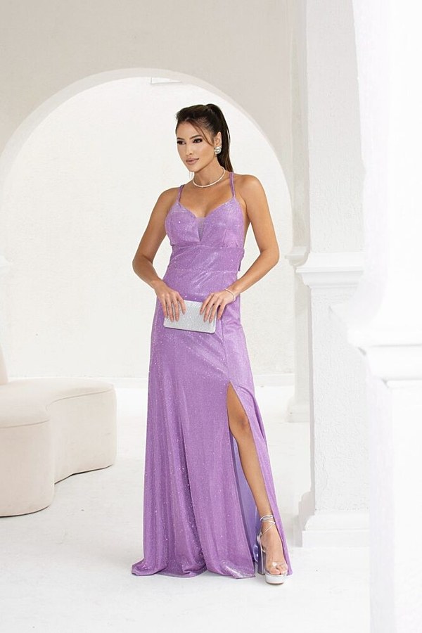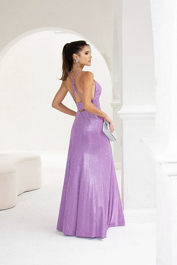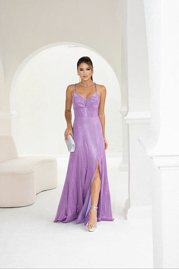 Vestido Longo Confeccionado em Tecido de Lurex. modelo de Alça Dupla e Fina, Decote V em Tule e Fenda Na Lateral.