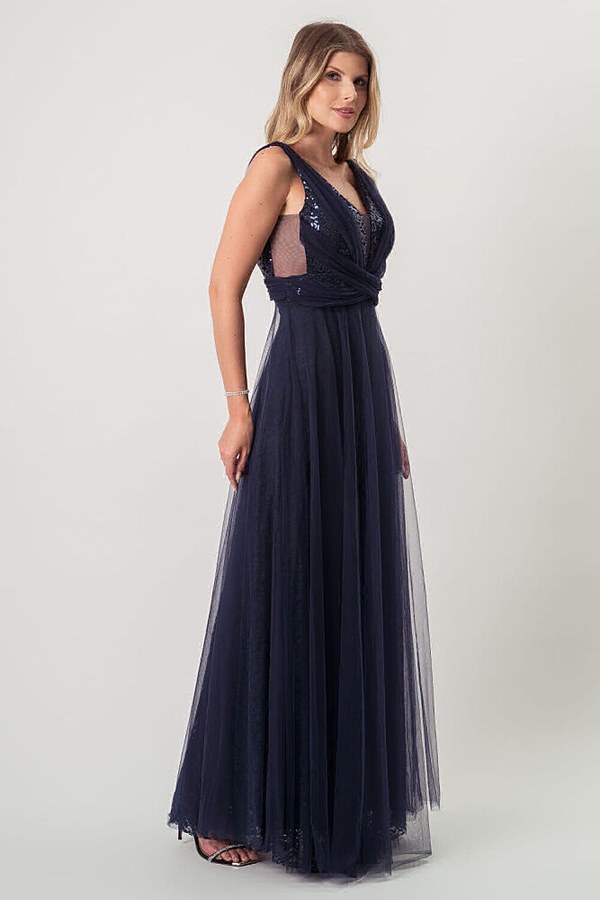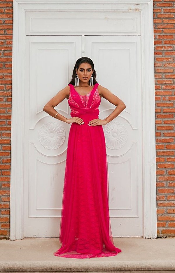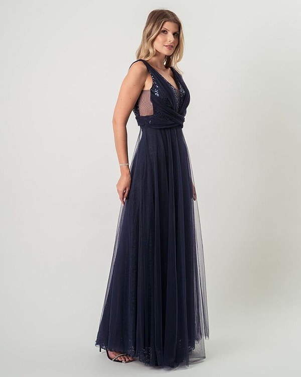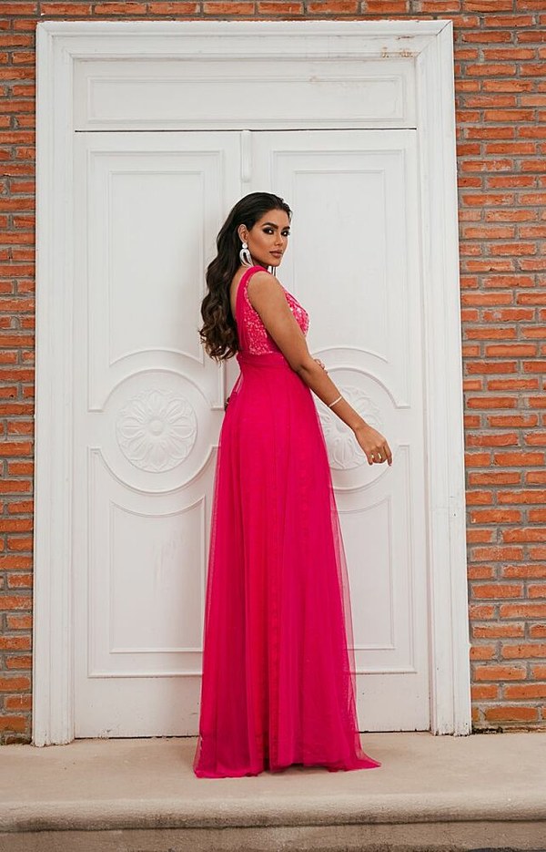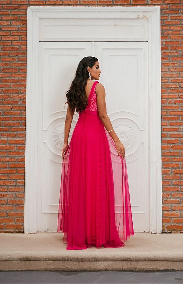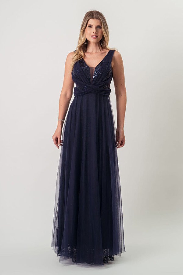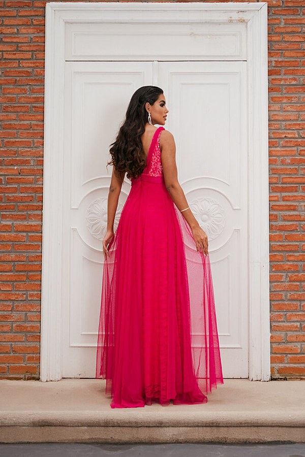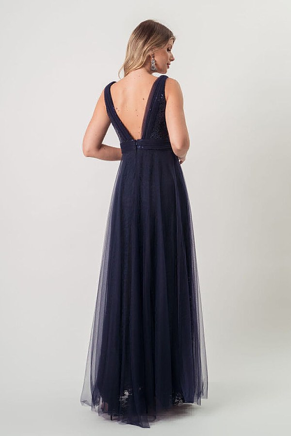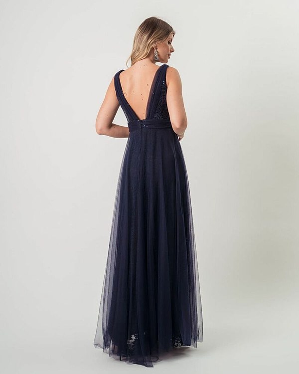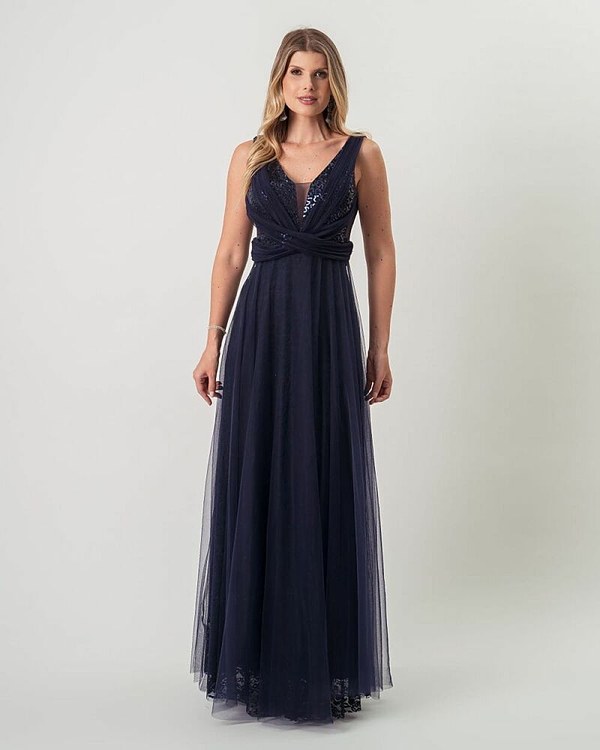 Vestido Longo em Paetê com Detalhe em Tule Plissado e Saia com Forro em Renda e Saia de Tule. decote V em Tule.