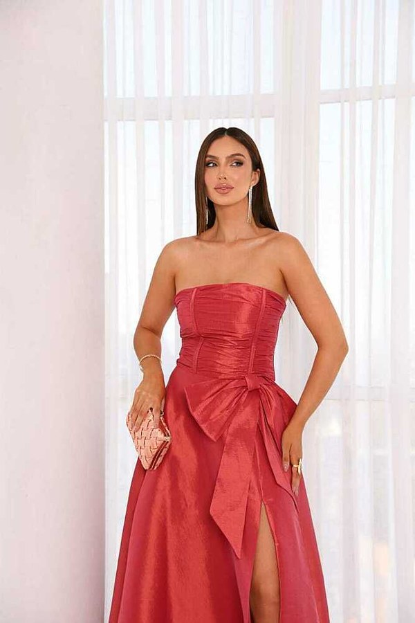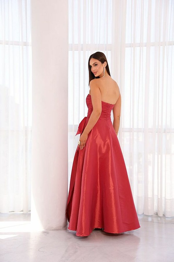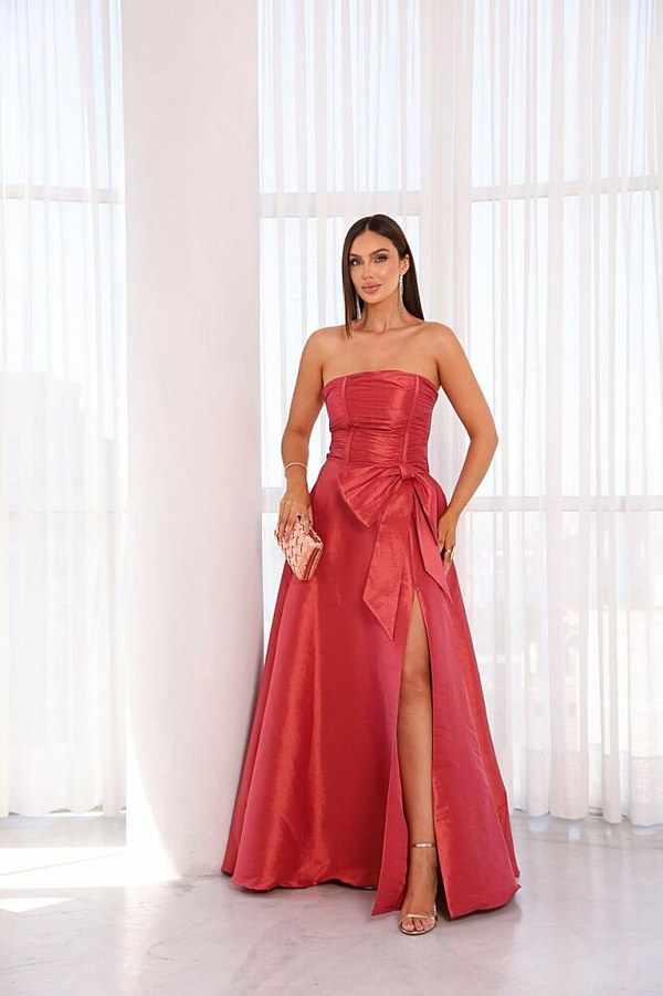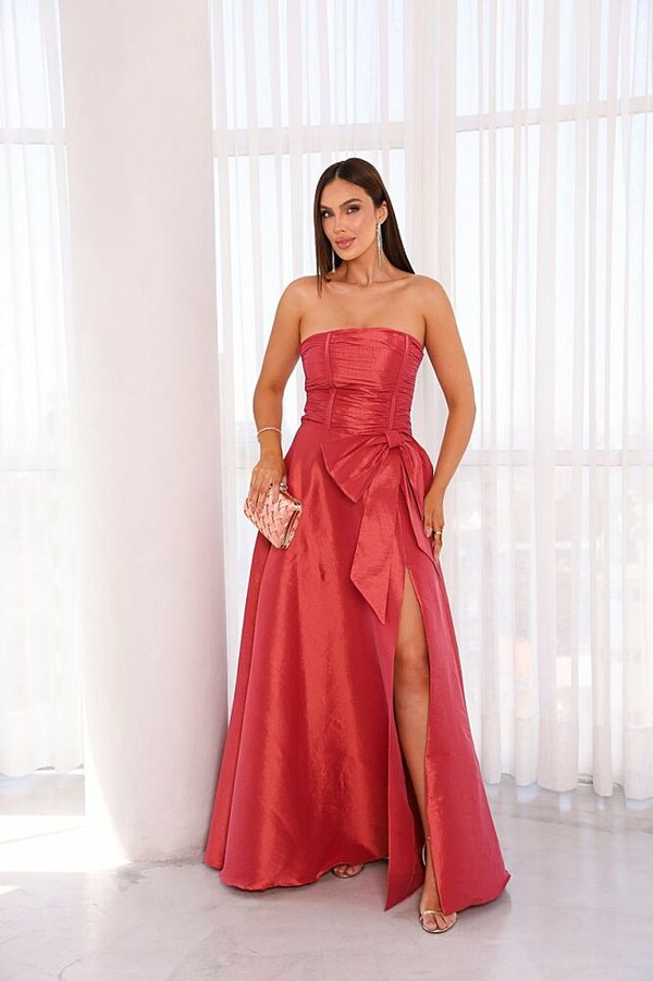 Vestido Longo confeccionado em tecido Tafeta. Tomara que caia busto dapeado, possui um laço. Modelo vai do 38 ao 44.