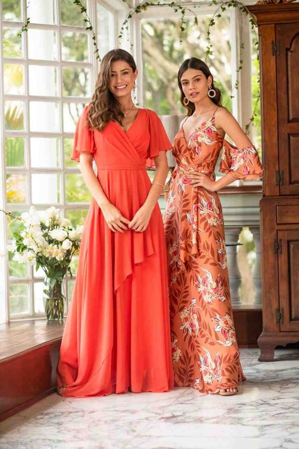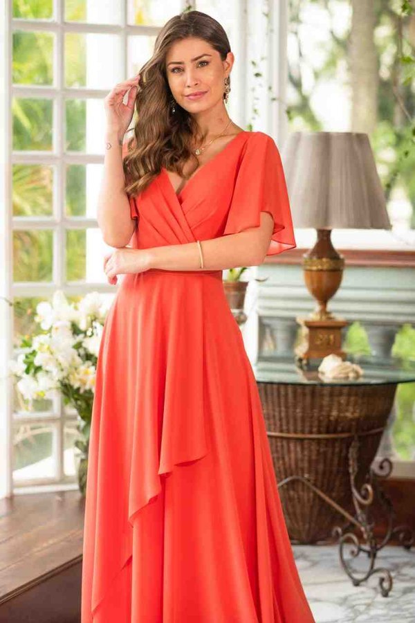 Vestido longo confeccionado em Chiffon Liso. Modelo toque suave e com muita leveza. Possui manga, drapeado no busto e saia rodada com muito movimento.