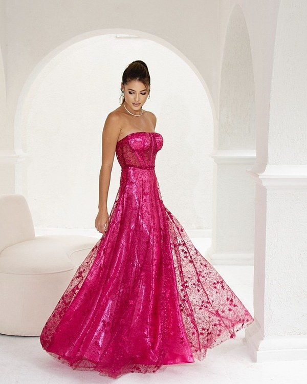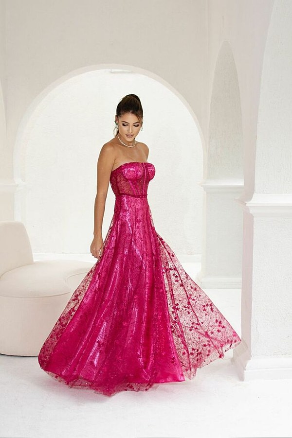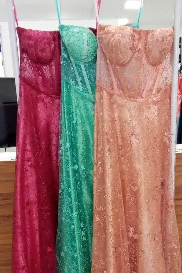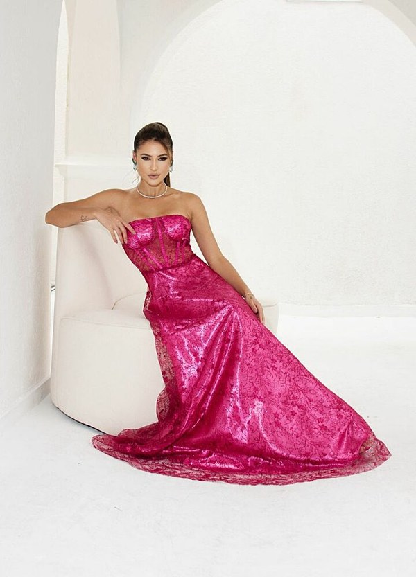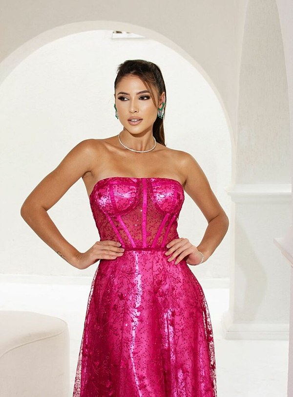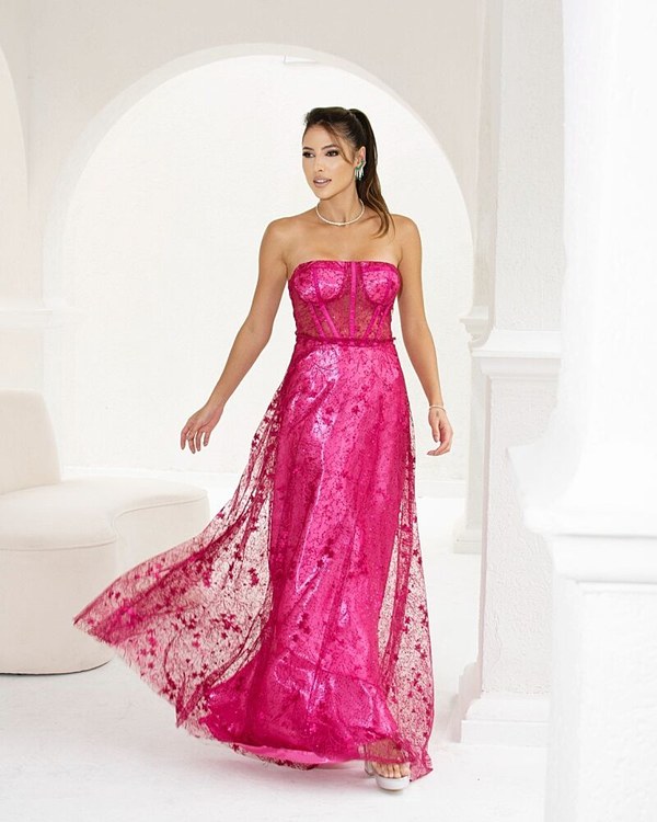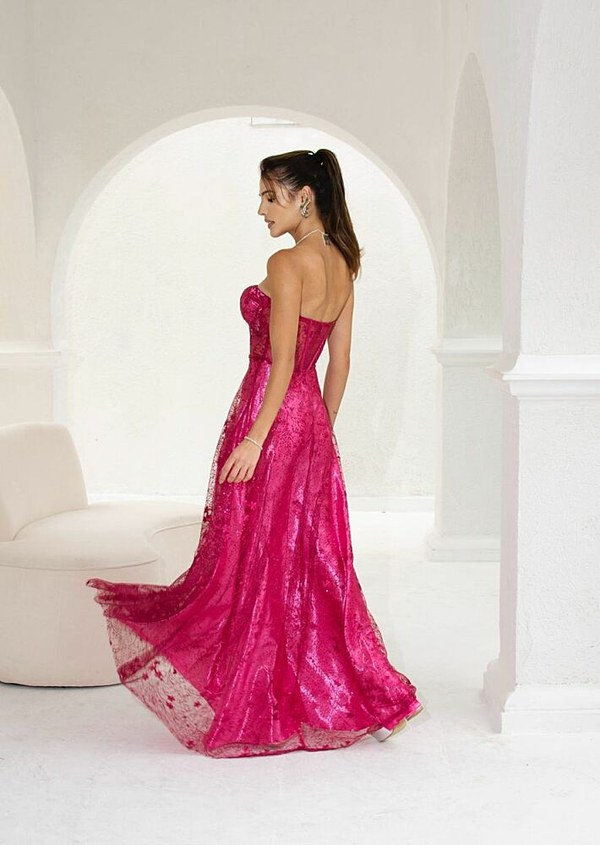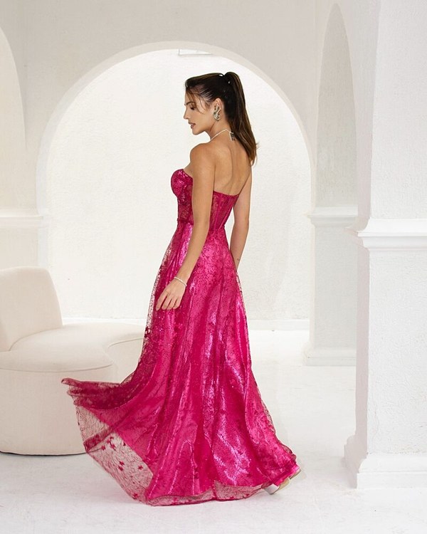 Vestido Longo Confeccionado em Tecido de Renda com Bordado em Paetê. modelo Tomara Que Caia, Busto Corselet e Saia Rodada.