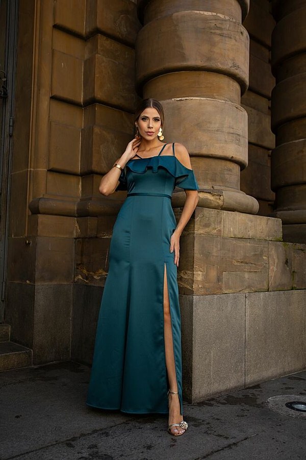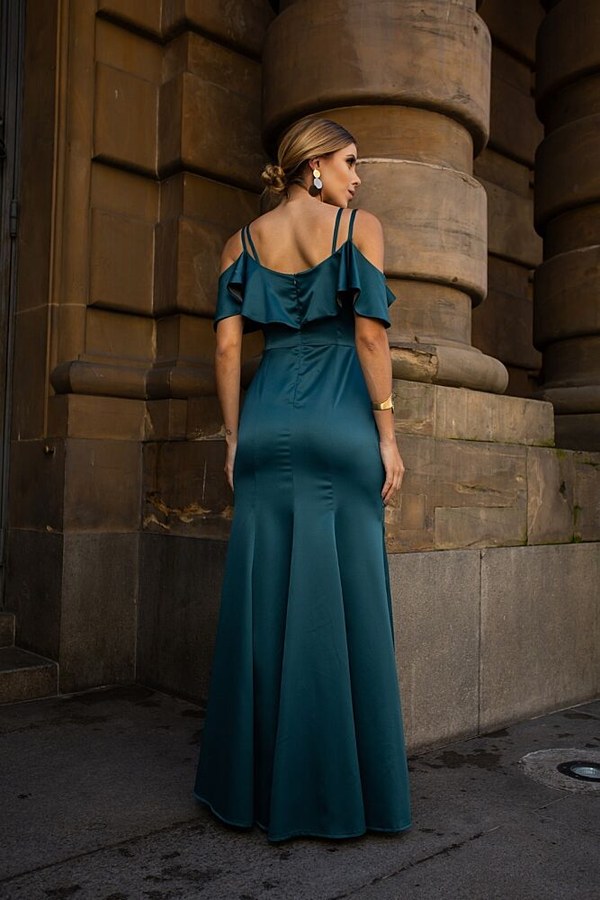 VESTIDO LONGO CONFECCIONADO EM TECIDO ACETINADO. MODELO DE ALÇA FINA DUPLA, BABADO NO BUSTO, SAIA JUSTA E FENDA NA LATERAL.