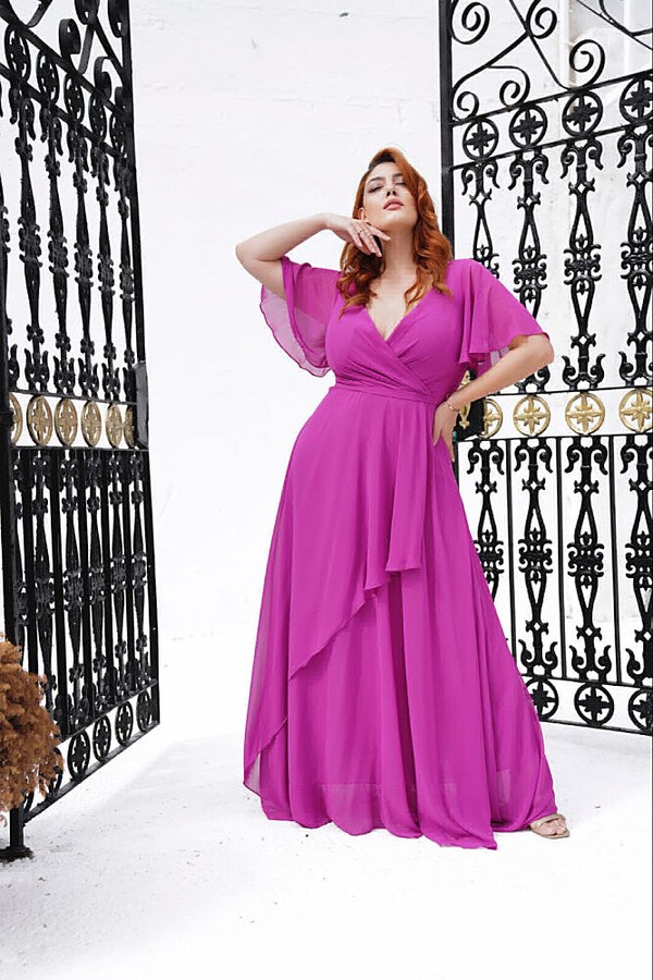 Vestido Longo Plus Size Confeccionado em Tecido de Crepe. modelo de Manga 3/4 com Abertura No Braço, Possui Bojo, Cinto com Fivela e Saia Rodada