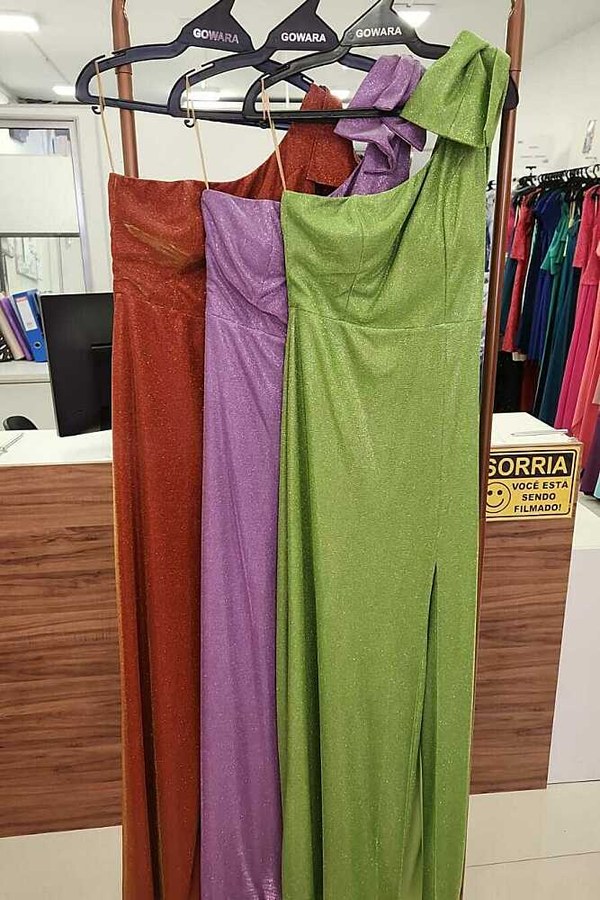 Vestido Longo Confeccionado em Tecido de Lurex Importado. modelo nula manga com Laço, Saia Mais Justa e com Fenda.