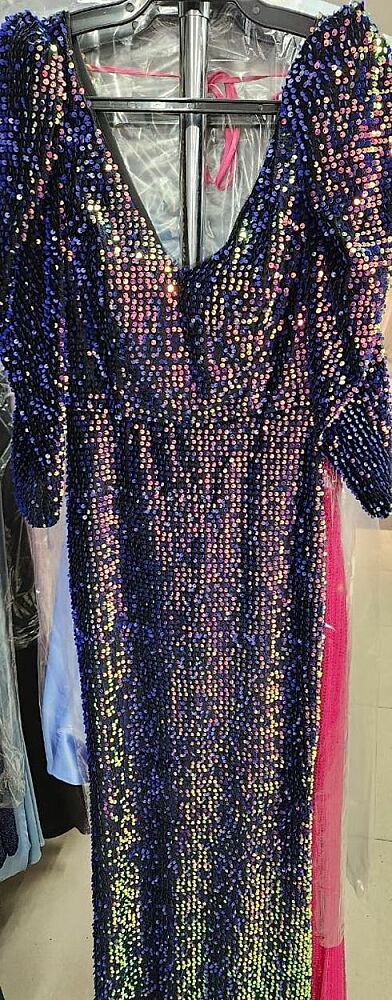 Vestido Longo Confeccionado em Veludo com Paetê. modelo Sereia, Decote V e Manga Bufante 3/4.