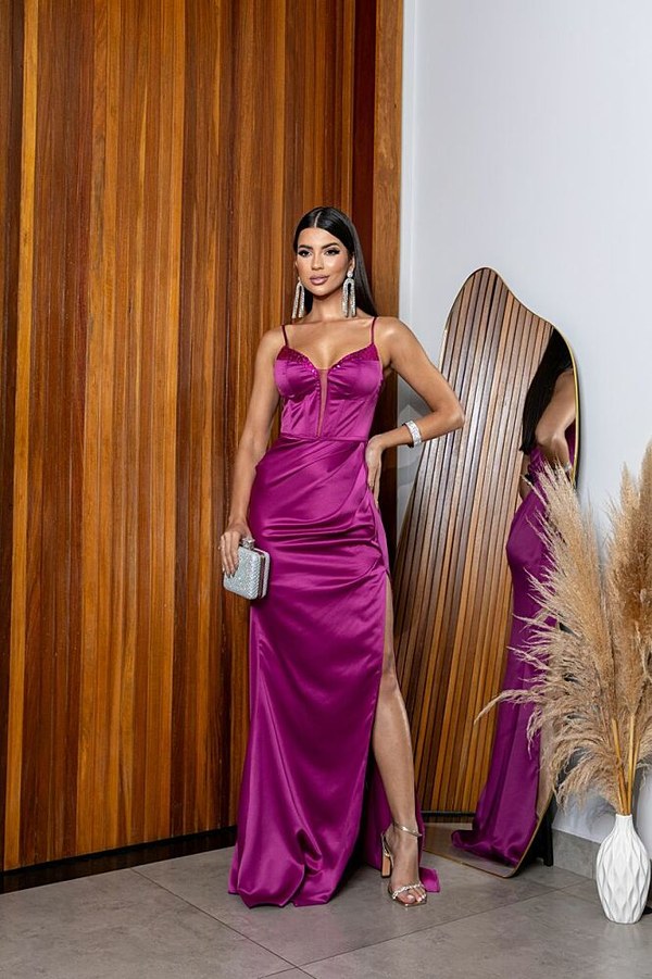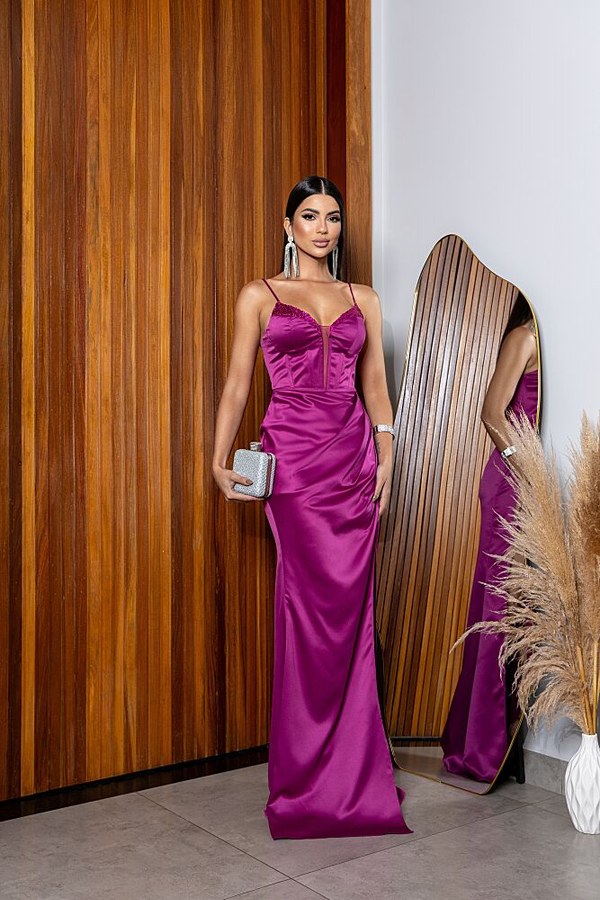 VESTIDO LONGO CETIM LYCRA BUSTO DETALHE DE PAETE
