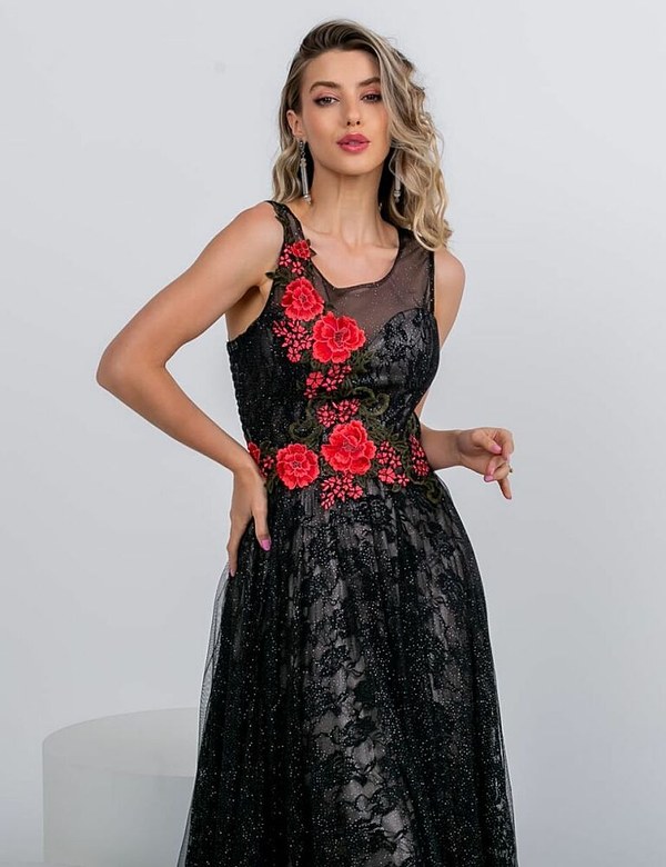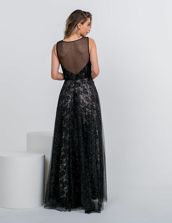 Vestido Longo Confeccionado em Tule de Brilho. modelo de Decote Canoa, Detalhe de Gripper No Busto, Elastex Nas Laterais e Saia Rodada.