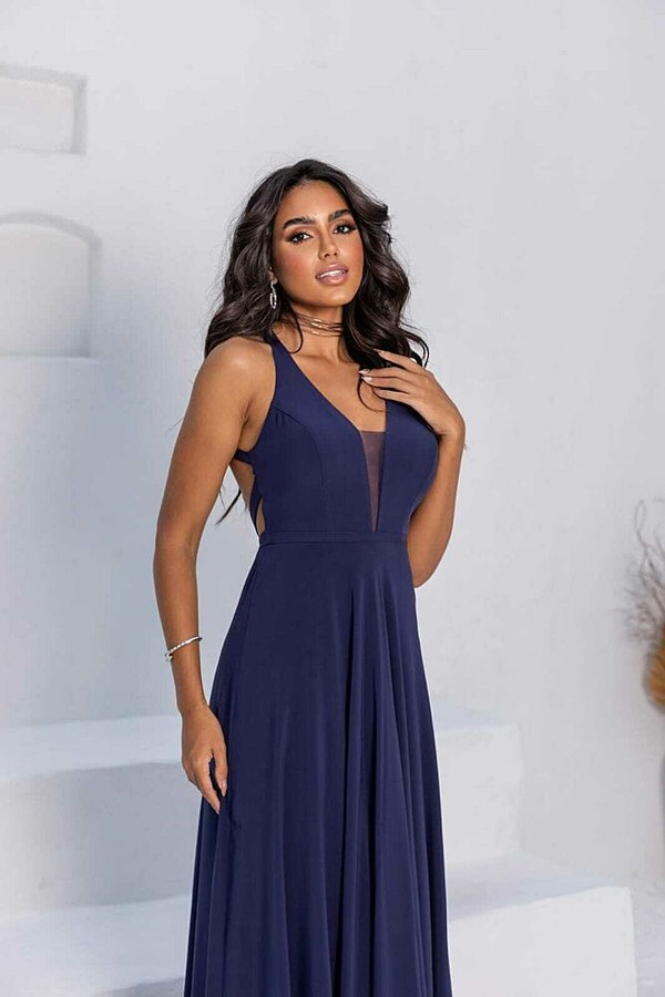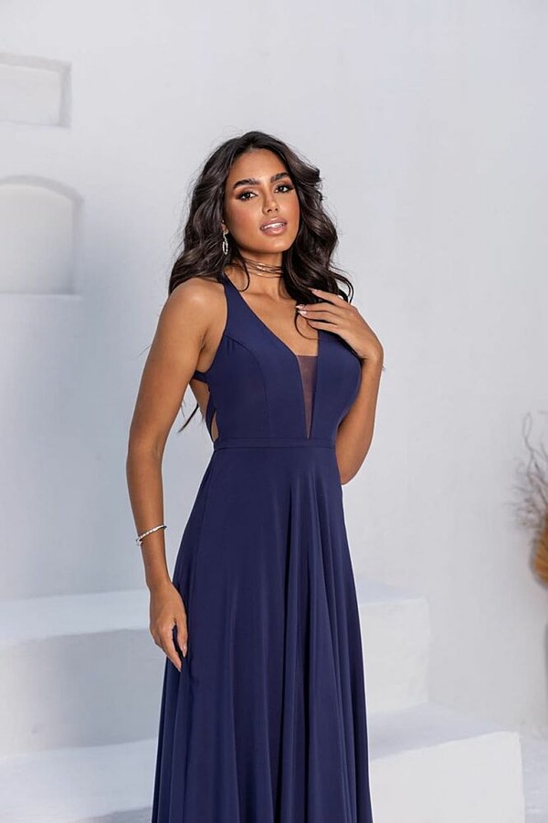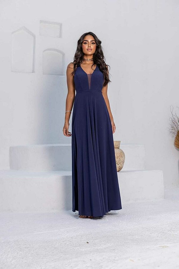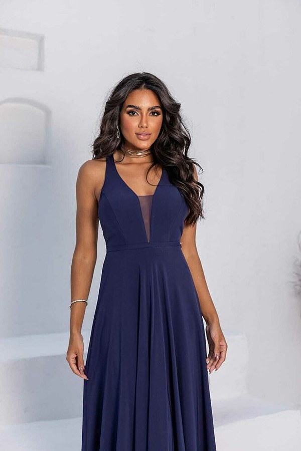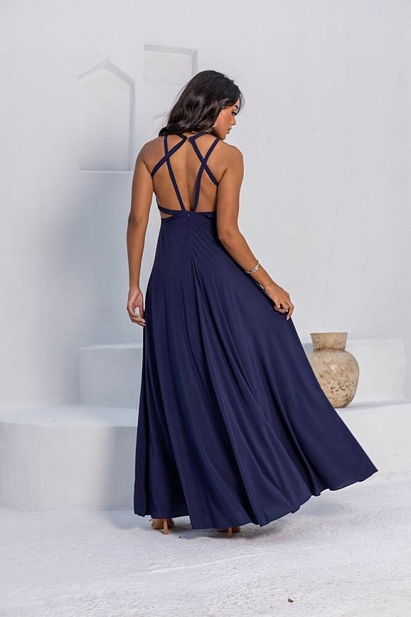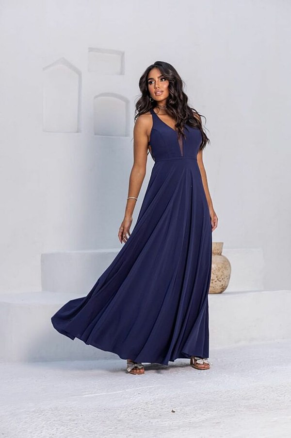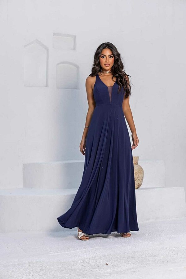 Vestido Longo Confeccionado em Chiffon. modelo Liso, Decote V em Tule e Costas Abertas com Detalhe Cruzado.