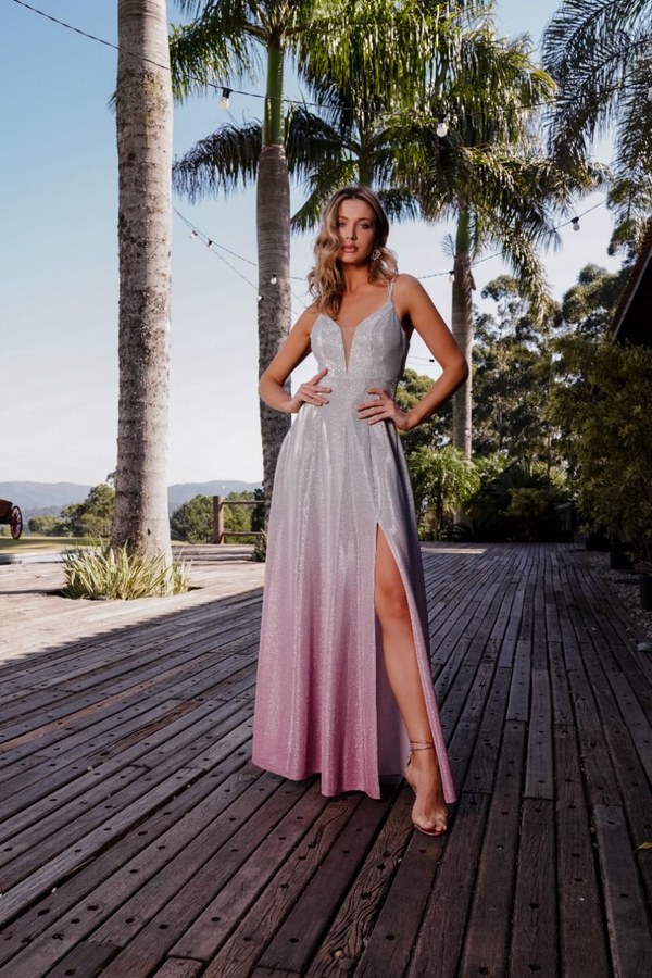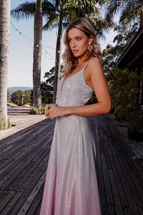Vestido Longo Confeccionado em Lurex Importado Tie Dye Exclusivo Da Loja. modelo Possui Bojo, Alça Dupla, Decote V com Tule, Saia Evasê com Fenda Na L...