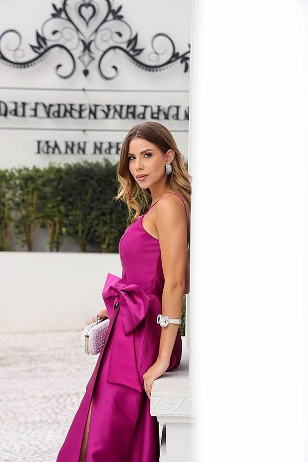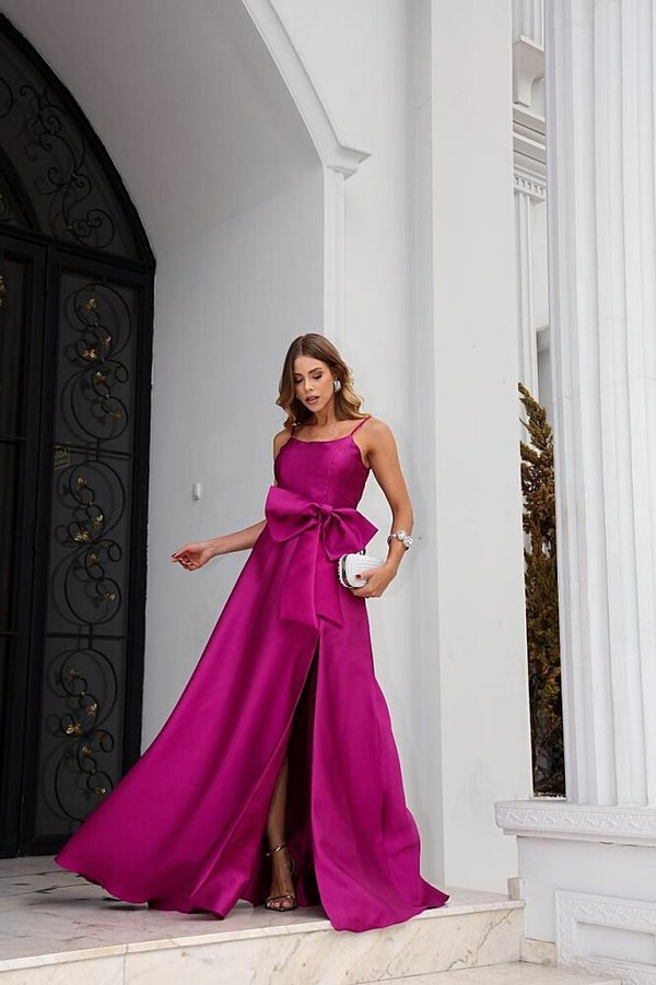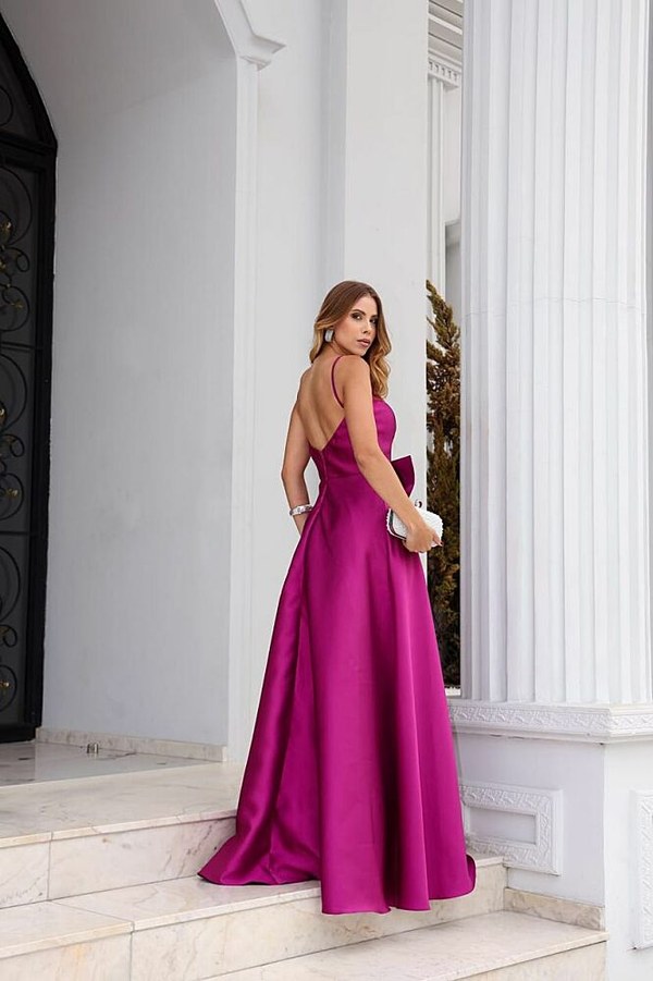 Vestido Longo Confeccionado em Tecido Zibeline. Modelo vai do 38 ao 44, Possui Bojo, Decote Canoa, Saia Evasê com Laço Opcional.