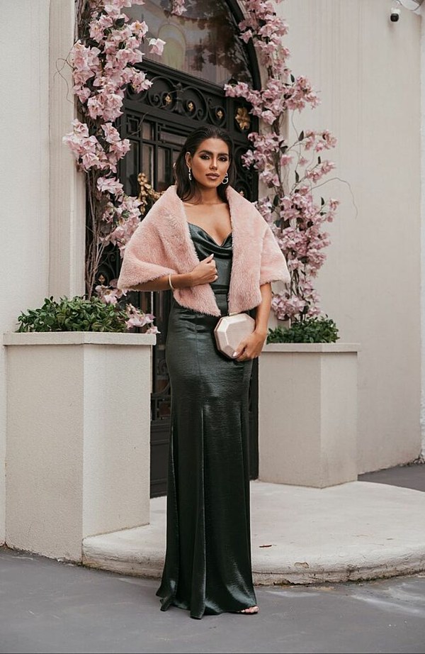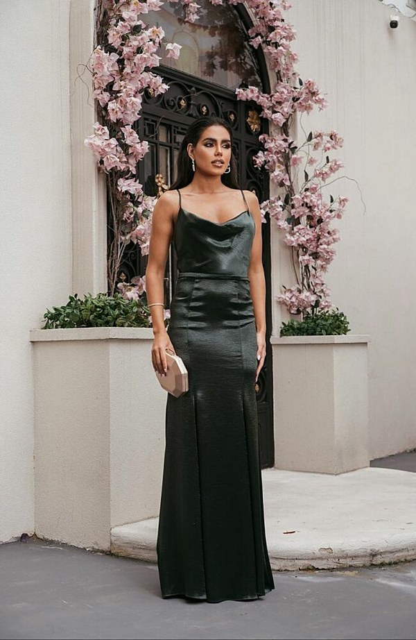 Vestido Longo Confeccionado em Cetim. modelo de Alça Fina, Saia Justa e Busto Caído.